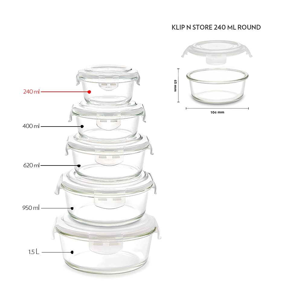 Borosil 240 ml Round Glass Food Storage Container with Air Tight Lid Glass Container for Lunchbox Microwave & Dishwasher Safe 1 Piece