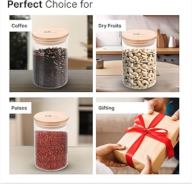 SHINEMAX Clear Glass Jar with Wooden Airtight leakproof Bamboo Lid for kitchen pantry Nuts,tea,sugar,coffee,spices,masala ||Gifting Item||Uses in