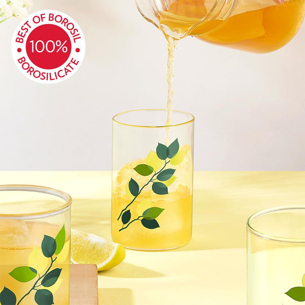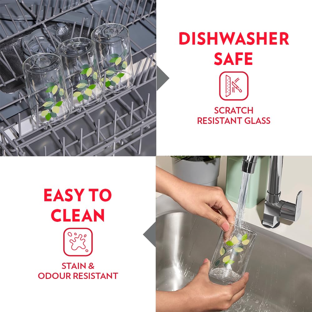 Borosil Vision Green Leaves 295 ml 6 pcs Set Transparent Drinking Glass Borosilicate Glass Tumblers for Water, Cold Drinks, Juice Flame Proof, Microwave & Dishwasher Safe for Daily use & Gifting