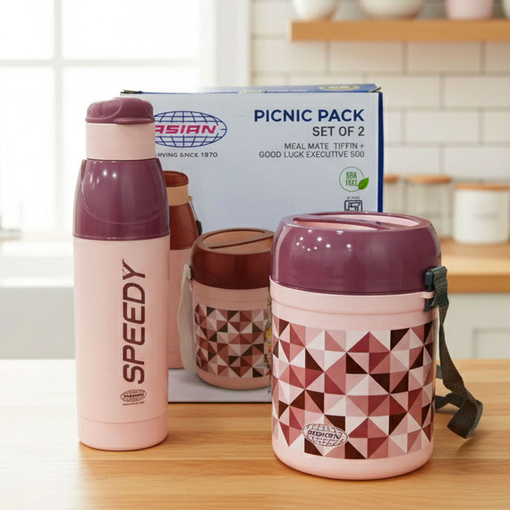 Convenient 2-piece picnic combo that includes a Meal Mate insulated tiffin and a Good Luck Executive 500 ml bottle.