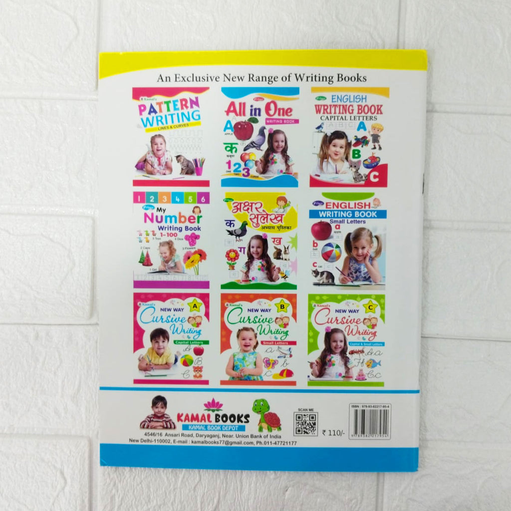 It is part of a series of educational books, including Pattern Writing, English Writing (Capital & Small letters), Hindi writing, Cursive Writing, and All-in-One learning books (as shown on the back cover).