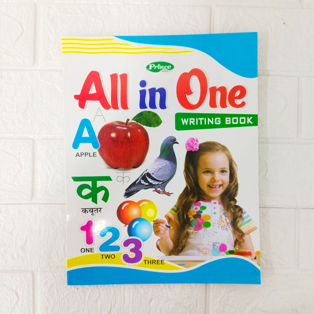 The cover highlights various learning elements, including the English alphabet (A for Apple), Hindi alphabet (क for कबूतर), and numbers (1, 2, 3).