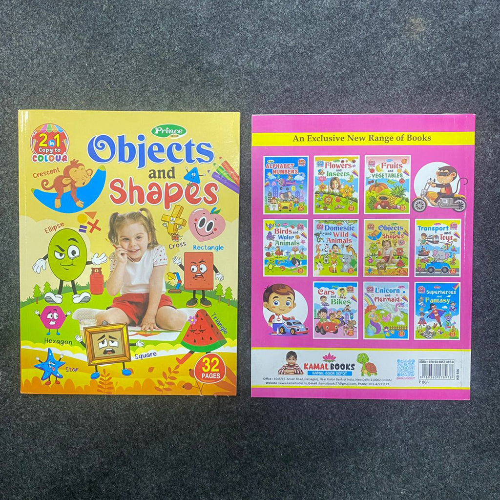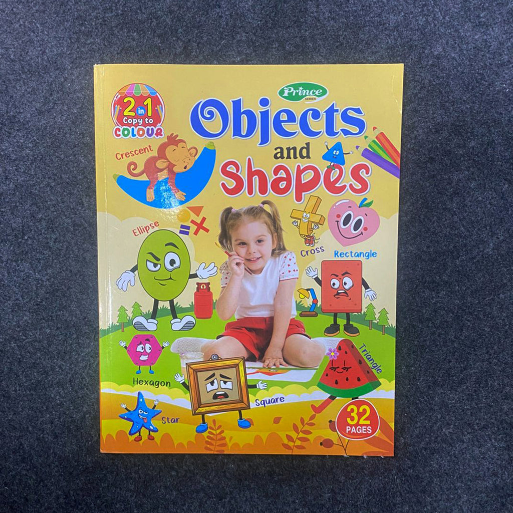 This is a colouring book for children titled "Objects and Shapes" that includes a "2 in 1 Copy to Colour" feature.