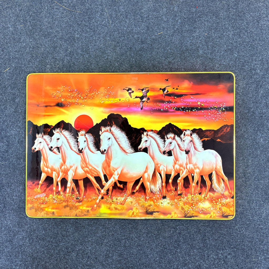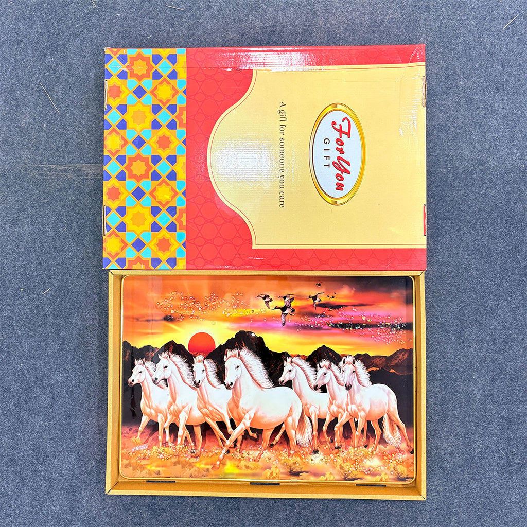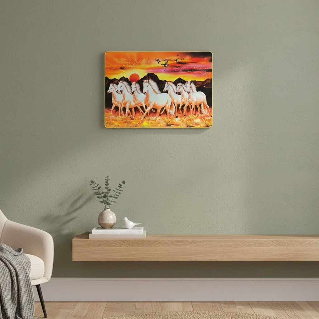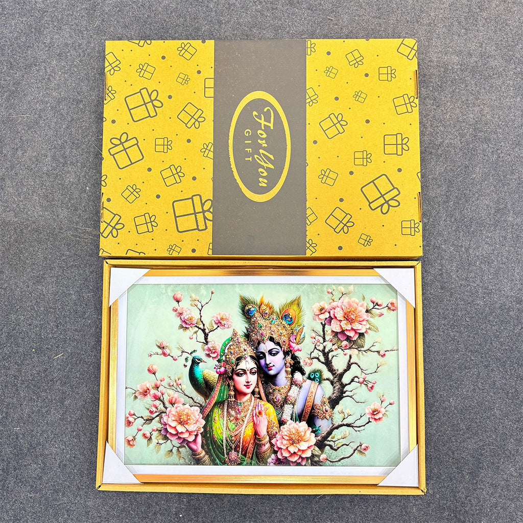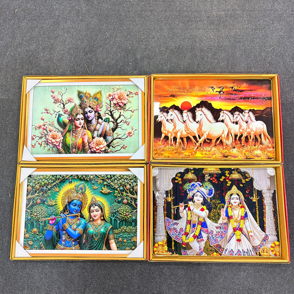• Divine Theme: A curated set featuring three unique depictions of Radha Krishna symbolizing love and peace, and one Seven Running Horses print symbolizing progress and success.