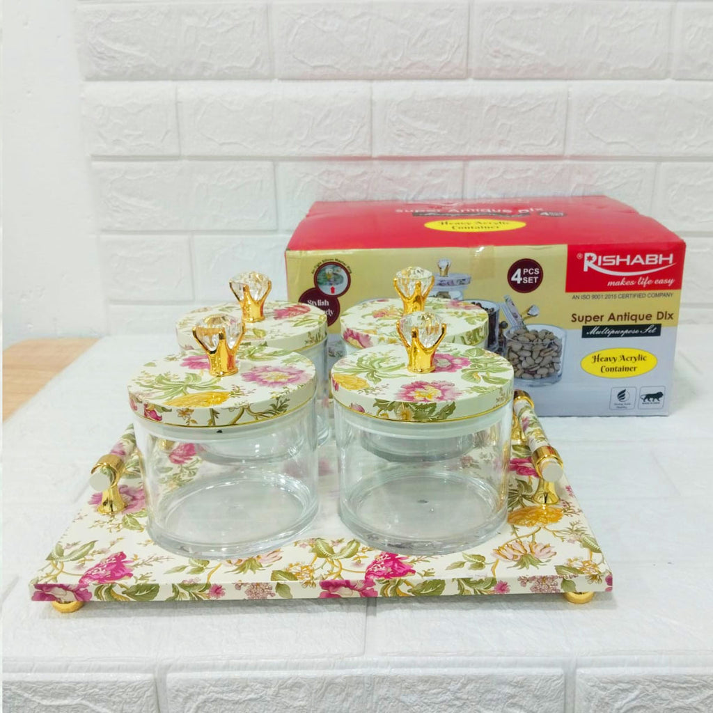 4-Piece Multipurpose Set – Includes 4 transparent jars with lids and a matching floral tray for elegant storage & serving.