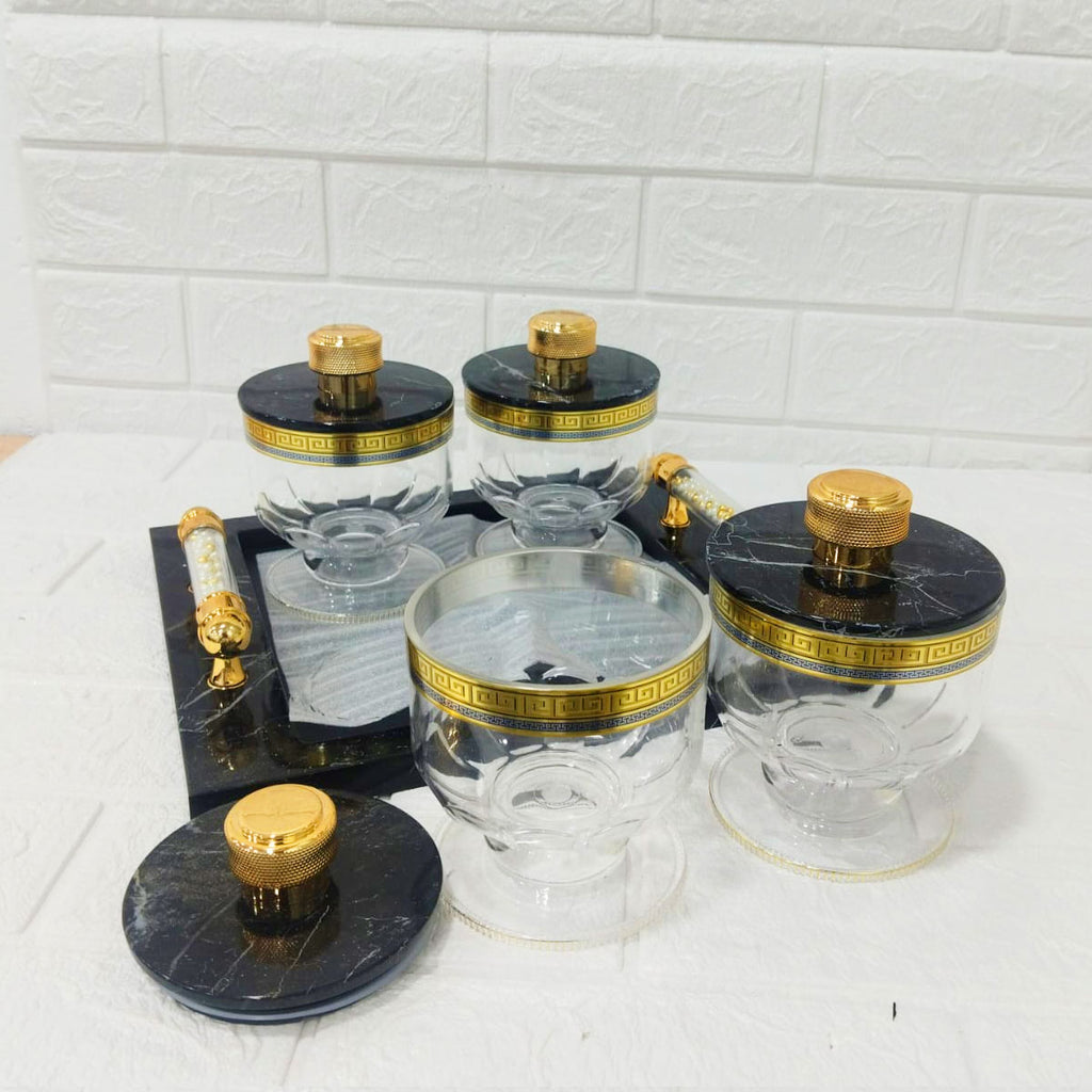 Di0165 Rishabh Cosmos Set of 4 Multipurpose Jars with Marble-Look Tray & Golden Lids