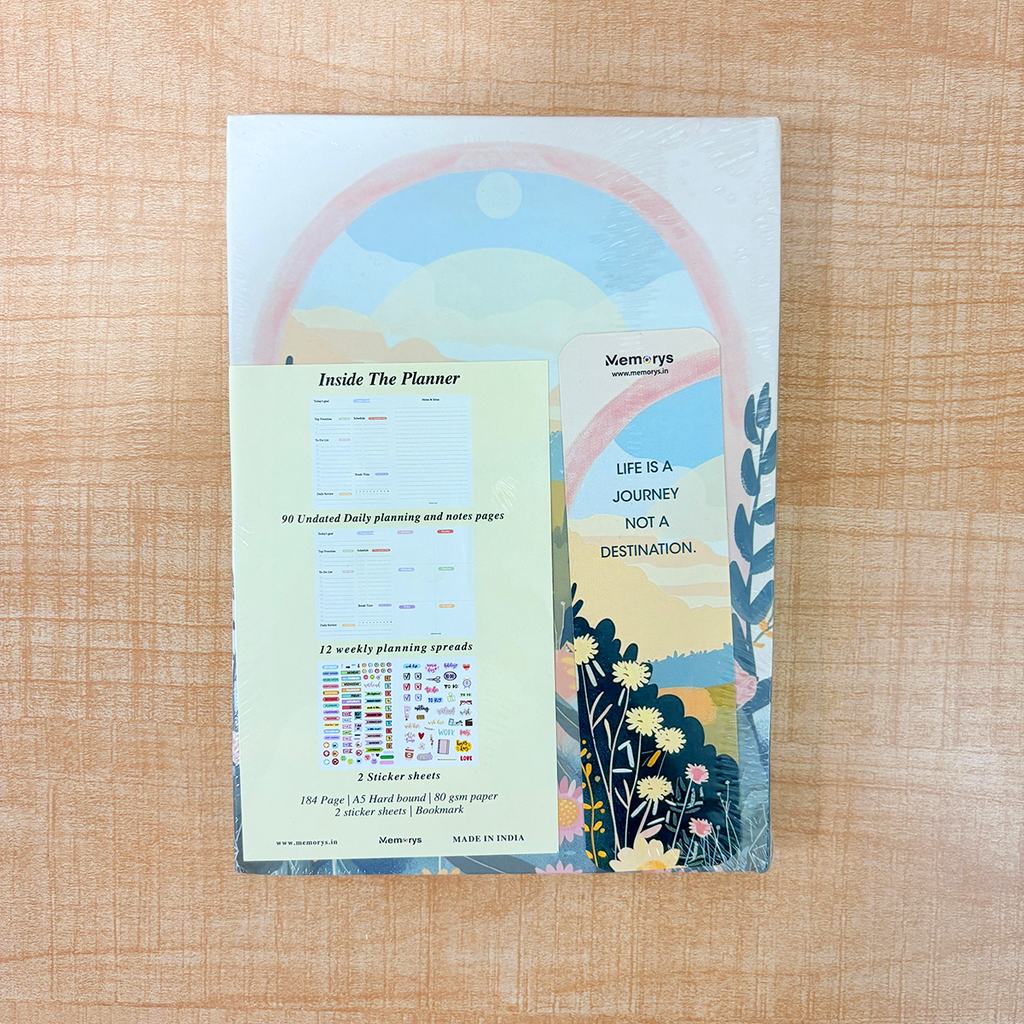 Bring calm to your schedule with the Serene Meadow A5 Daily Planner. Features a hardbound cover, Foil & UV detailing, and velvet lamination for a premium finish. Inside: