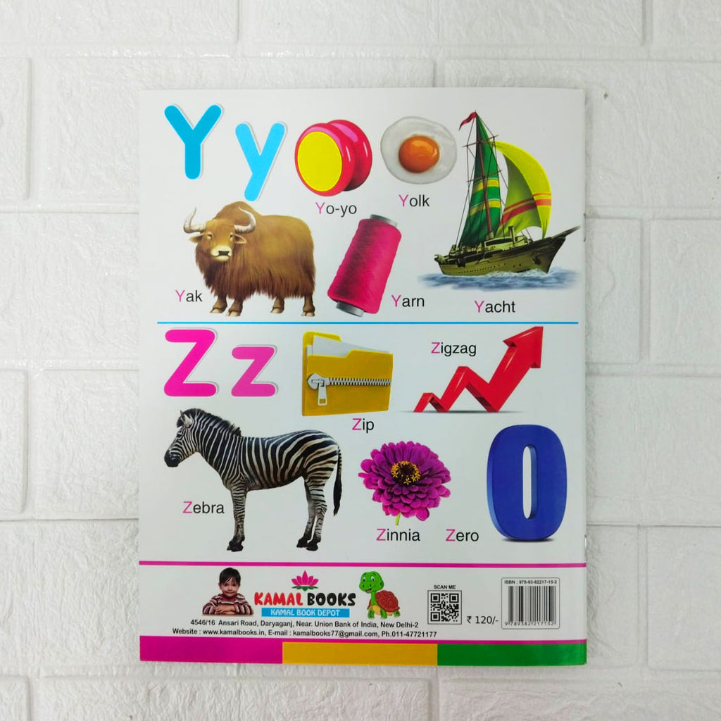 The cover features various images corresponding to different letters of the alphabet, such as an apple, a tiger, a peacock, a kingfisher, an airplane, a lotus, a train, a car, and cherries.
