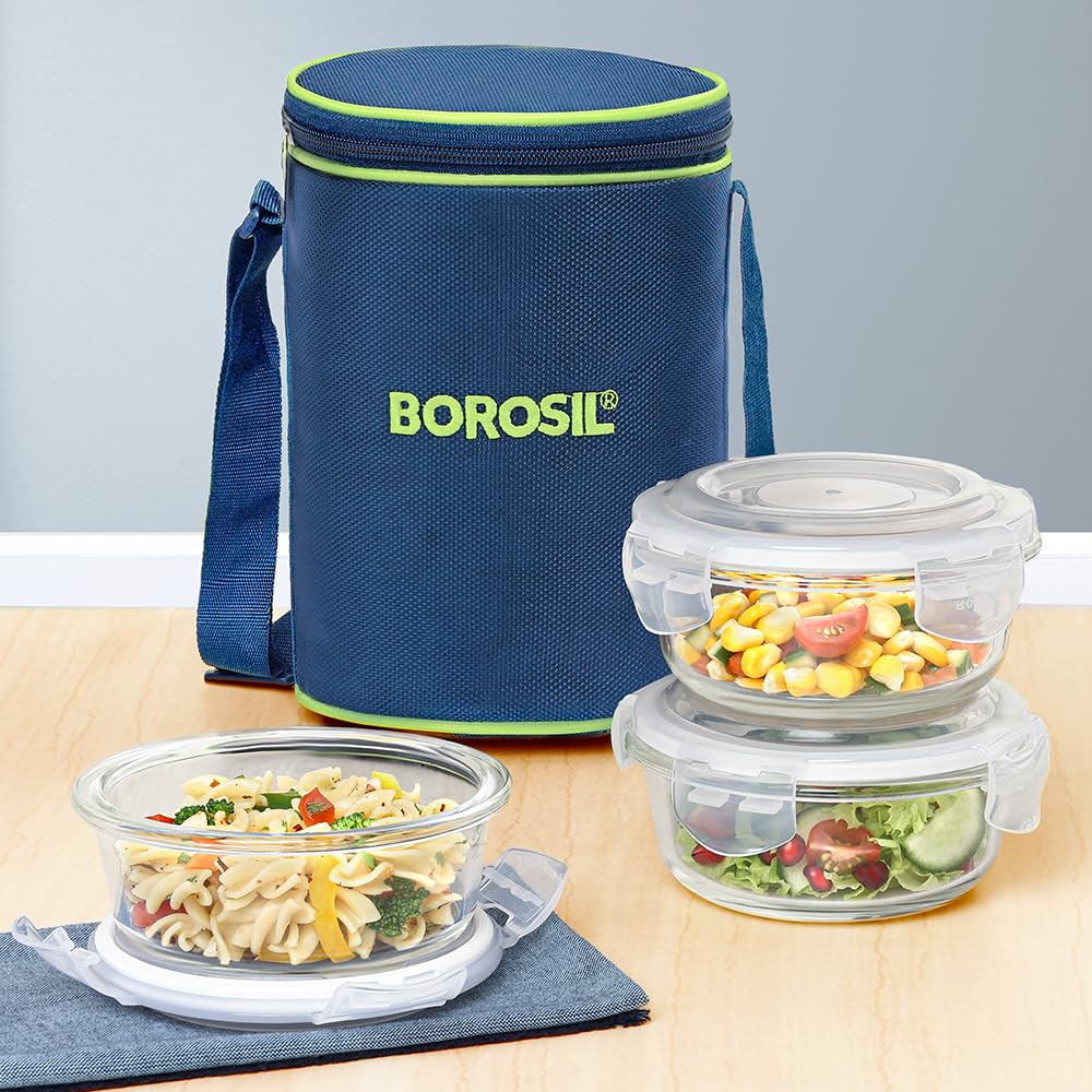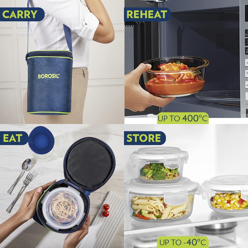 Borosil Lunchbox with Bag Set of 3 400ml Borosilicate Glass, Round, Vertical Microwave & Dishwasher Safe, Leak Proof Tiffin for Office, School, College (BGFGBTIF0026)