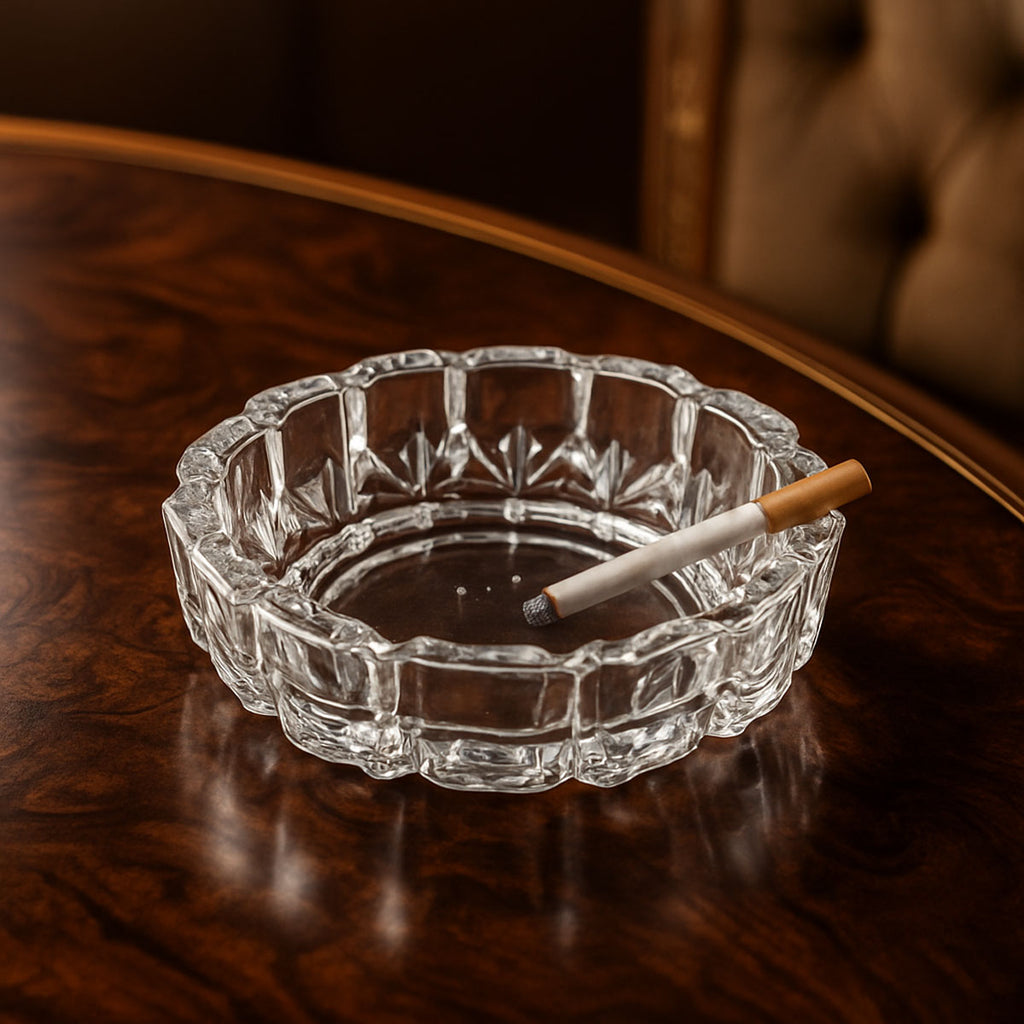 Elegant Design: This ashtray features a classic round shape and a beautifully cut crystal pattern that adds a touch of sophistication to any space. The clear glass construction allows it to blend seamlessly with various decor styles, from modern to traditional.