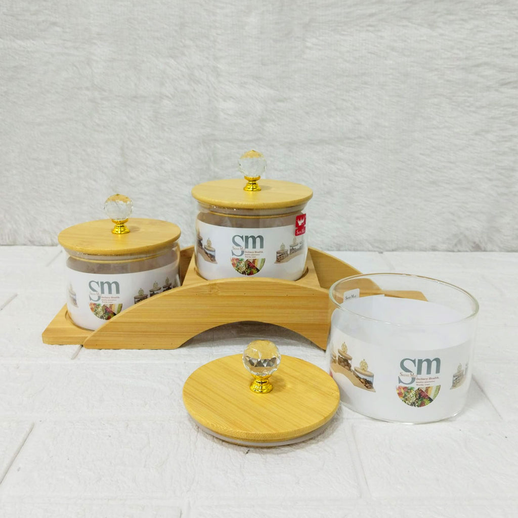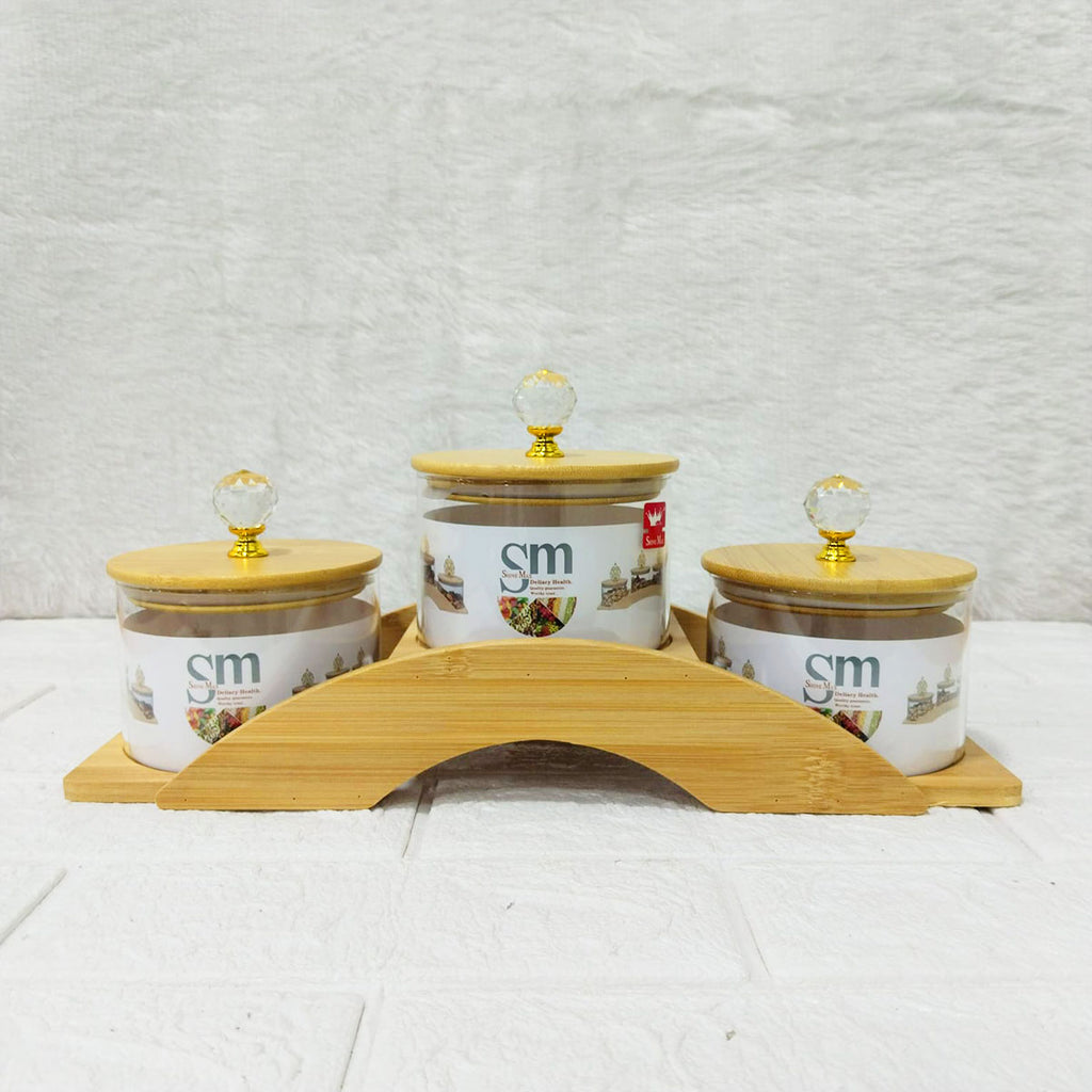 Base/Tray: The three jars sit securely on a bamboo or wood stand/tray that has a distinctive arched design.