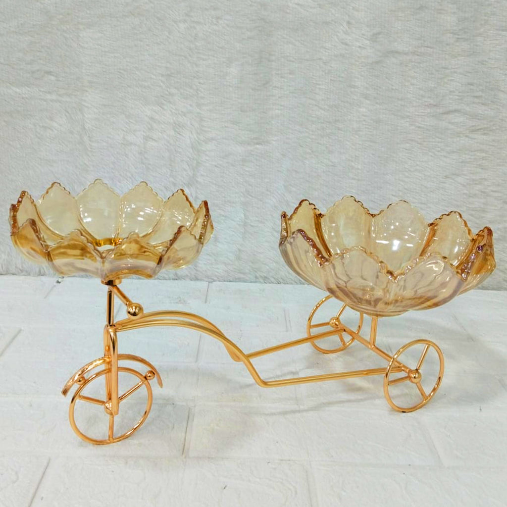 AM6273 Elegant Twin Glass Bowl with Golden Tricycle Stand – Decorative Serving Set
