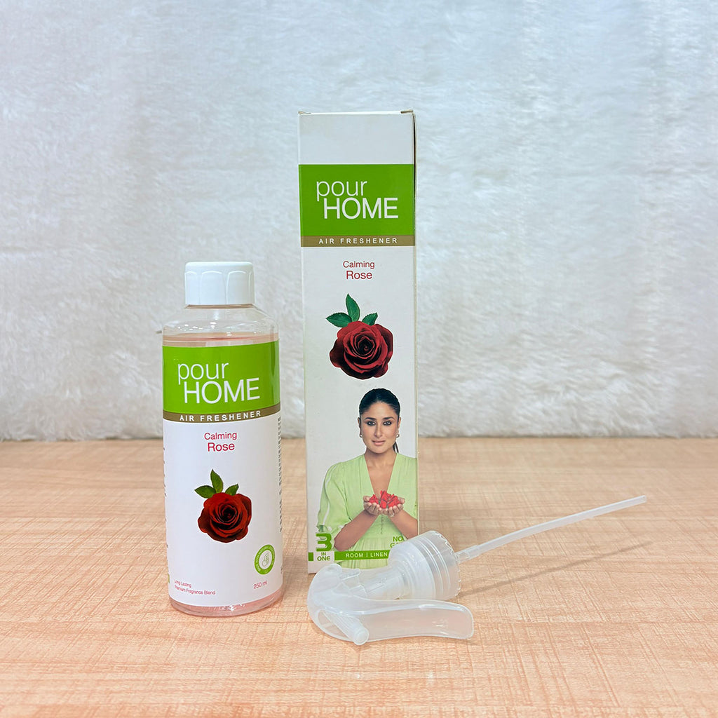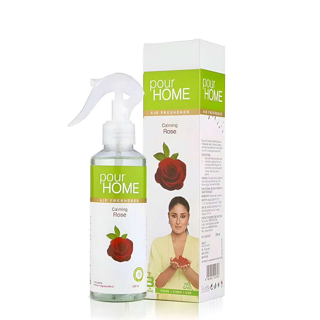- Pour Home 250 ml Calming Rose Fragrance Liquid Form No Gas Air Freshener Spray (Pack of 2) delivers the timeless charm of rose in a modern, eco-friendly form. With no gas and a water-based formula, this spray ensures a gentle yet effective dispersion of fragrance. Ideal for bedrooms, living spaces, or office corners, the Calming Rose scent creates a serene, welcoming atmosphere.