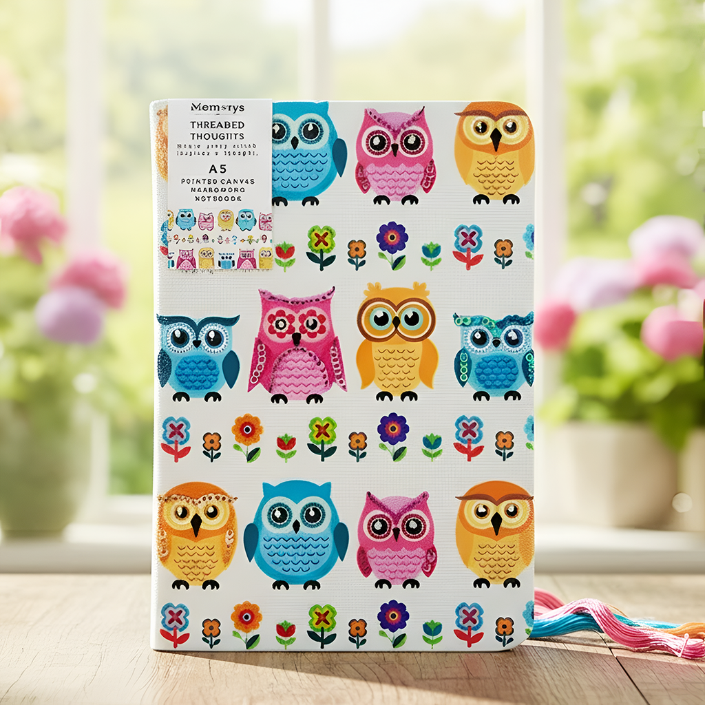 Adorable owl prints paired with hand embroidery give this notebook a unique charm. Perfect for kids and adults who love cute designs.