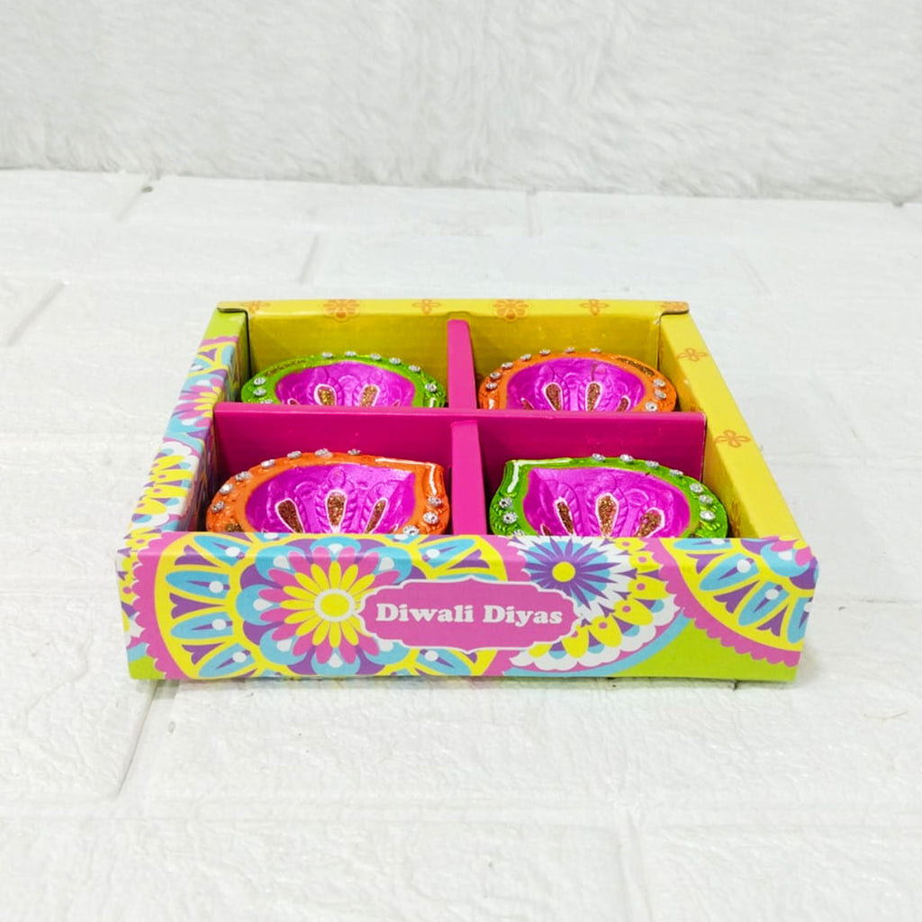 - Set of 4 beautifully handcrafted clay diyas in assorted designs and vibrant colors.