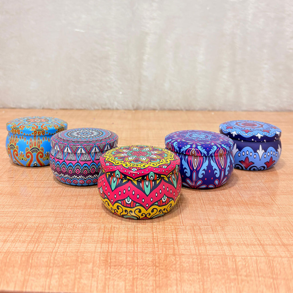 - DESIGN: Beautiful mandala-inspired tin candle featuring vibrant multicoloured geometric patterns and intricate details for an eye-catching decorative accent