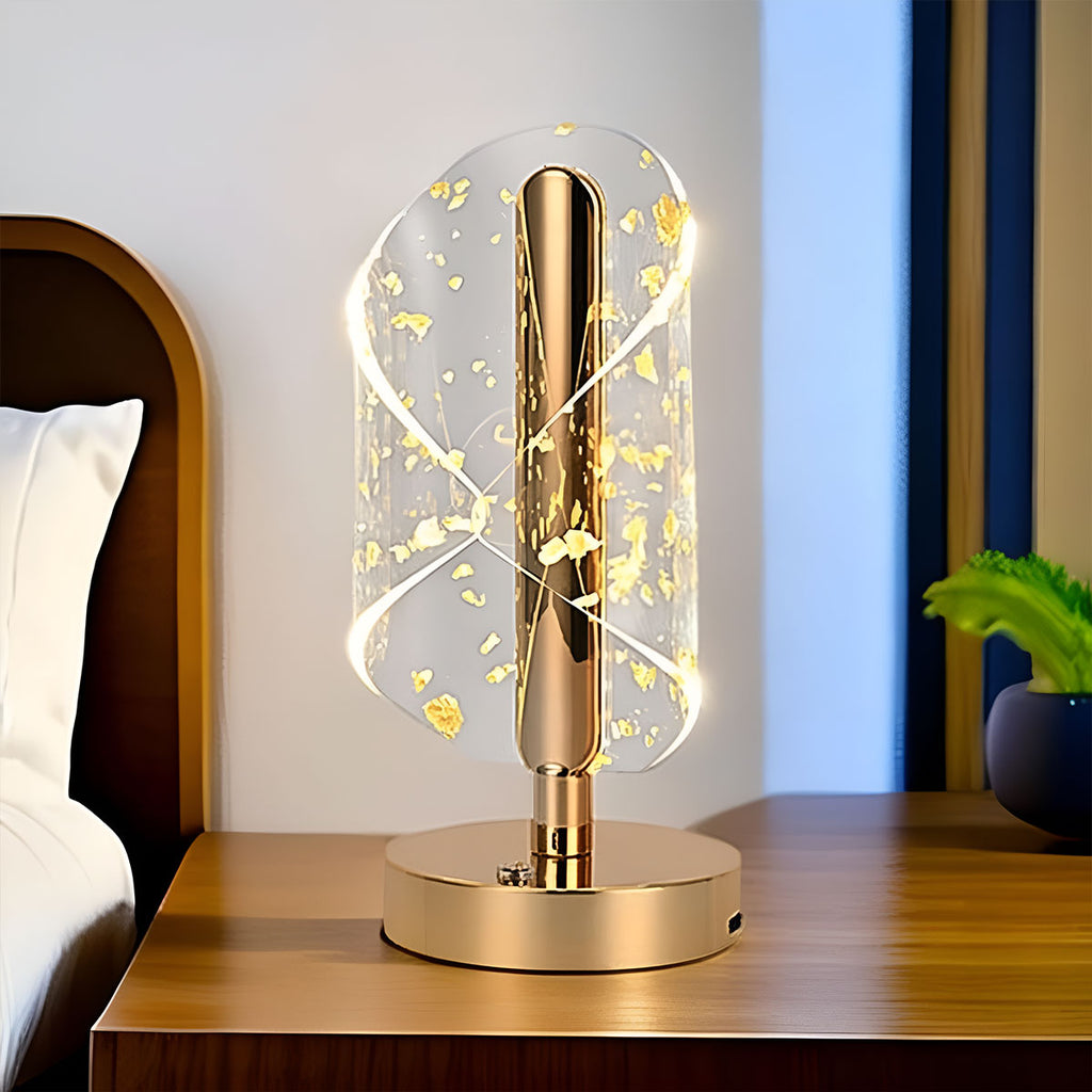 Shade: Features a transparent acrylic lamp shade accented with gold foil/leaf details for a sparkling, decorative effect.